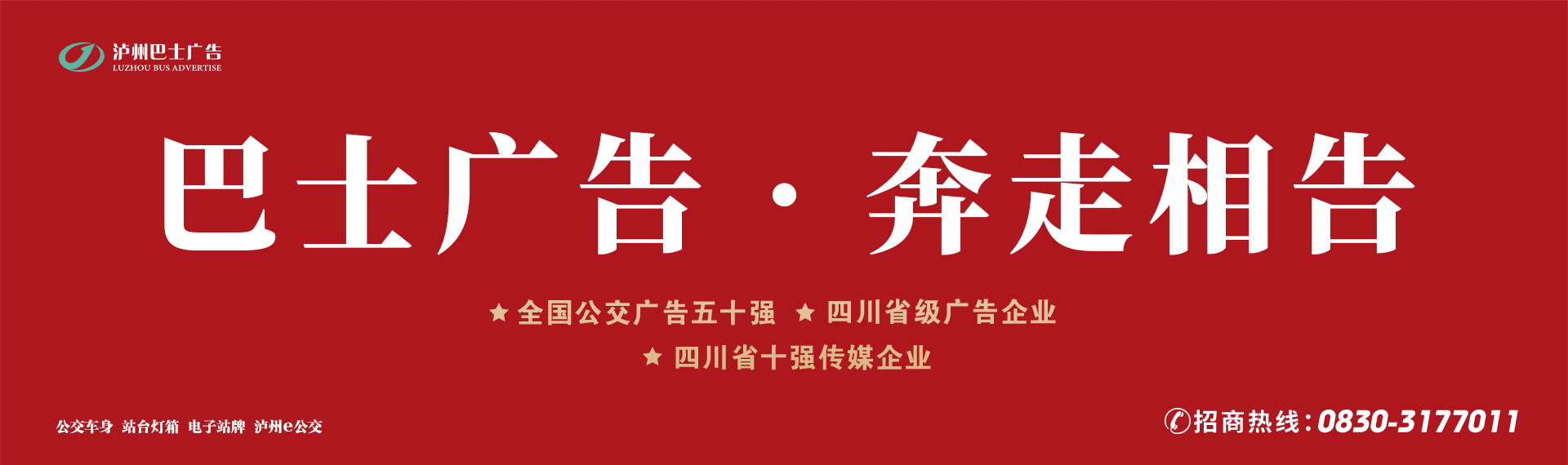 瀘州公交巴士廣告公司創(chuàng)建于1992年3月,是瀘州城市公交廣告媒體唯一經(jīng)營單位,媒體傳播及綜合影響力在同行業(yè)中穩(wěn)居前列。一直以來,秉承著“依法治企、制度管理、誠信為本、創(chuàng)新超越”的治企理念,立足城市公交服務(wù),開展實(shí)施“文化+公交”服務(wù)模式,圍繞“一線一特色”,為企業(yè)傳播價(jià)值,為社會傳遞正能量。