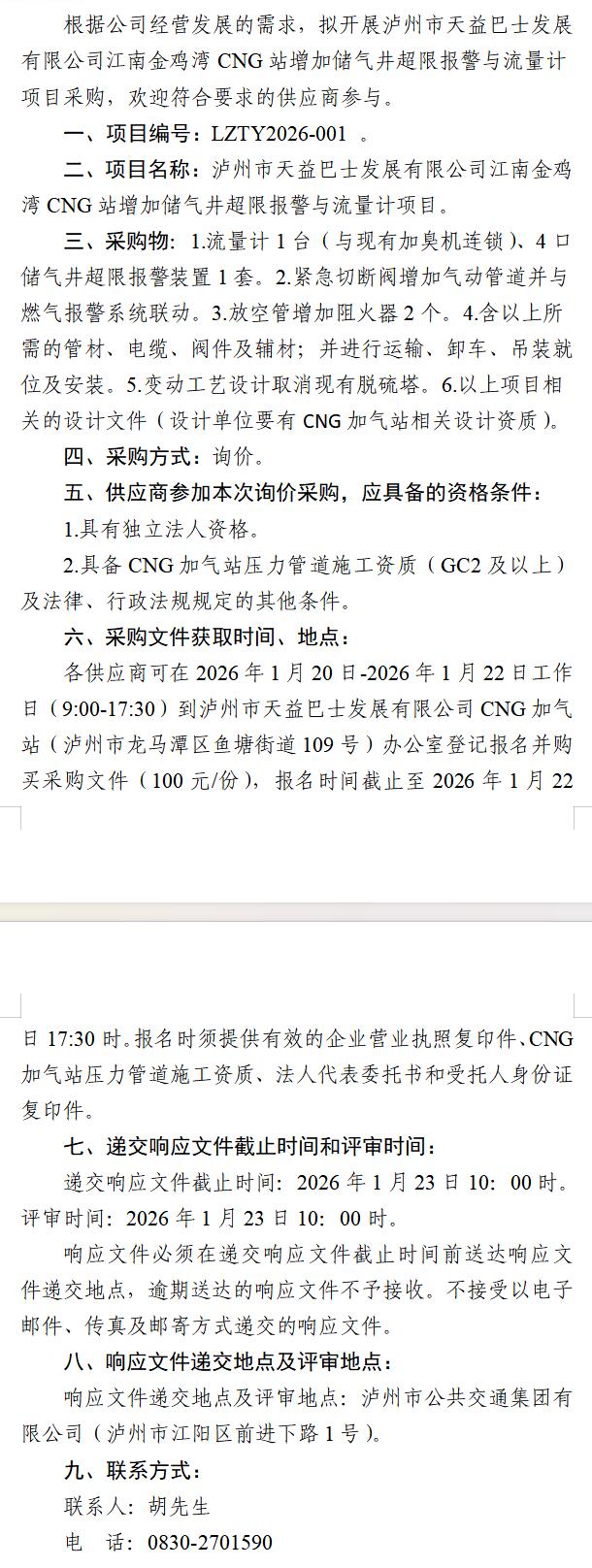 瀘州市天益巴士發(fā)展有限公司江南金雞灣CNG站增加儲(chǔ)氣井超限報(bào)警與流量計(jì)項(xiàng)目采購公告